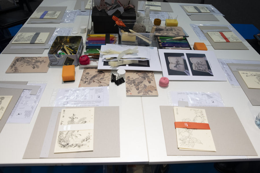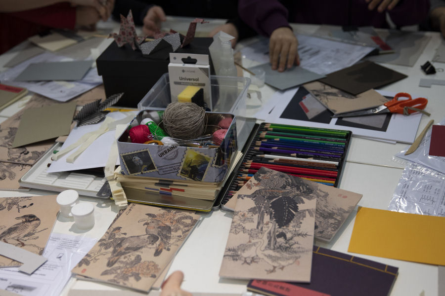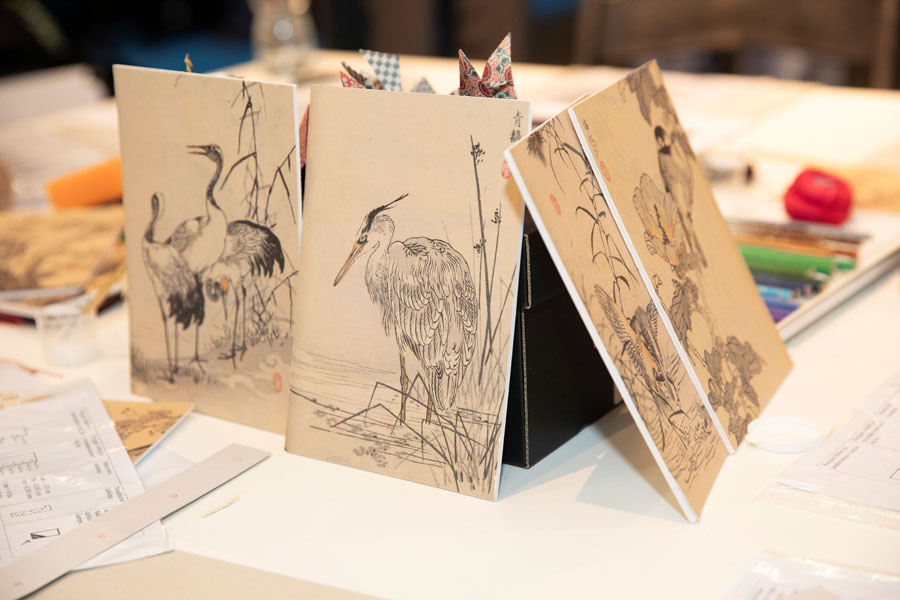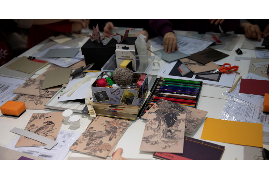 Dirbtuvėlėse dalyviai mokėsi originalaus kišenės principo – „fukuro-todži“ (jap. 袋綴じ, angl. „pouch binding“) – įrišimo subtilybių, sužinojo apie japonišką „vaši“ popierių, kitas gamyboje reikalingas natūralias medžiagas. Užsiėmimo pabaigoje dalyviai galėjo nuspalvinti paukščių piešinėlius-graviūras, kuriais dekoravo pasigamintus albumėlius.