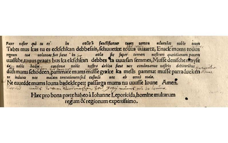 Vrublevskių bibliotekos Retų spaudinių skyriaus mokslo darbuotoja dr. Daiva Narbutienė, pristatydama rankraštinius latviškos maldos „Tėve mūsų“ taisymus, pabrėžė, kad juos surado ir nustatė Bibliotekos skaitytoja, baltistikos specialistė dr. Ernesta Kazakėnaitė, sklaidydama 1552 m. Bazelyje išspausdintos populiarios universalaus turinio knygos, kurioje pateikiama gausiai iliustruotos pažintinės informacijos apie Lietuvą ir kaimynines šalis, egzempliorių (LMAVB RSS K2-174). Jame (p. 789) smulkia rašysena tarp spausdinto latviško maldos teksto eilučių įterpti anonimiški taisymai, datuojami XVI a. II puse ar XVII a. pradžia. Šis redaguotas, latvių raštijos istorijoje iki šiol nežinotas maldos variantas yra unikalus – tokia forma nėra užfiksuotas nė viename XVI–XVII a. tekste.